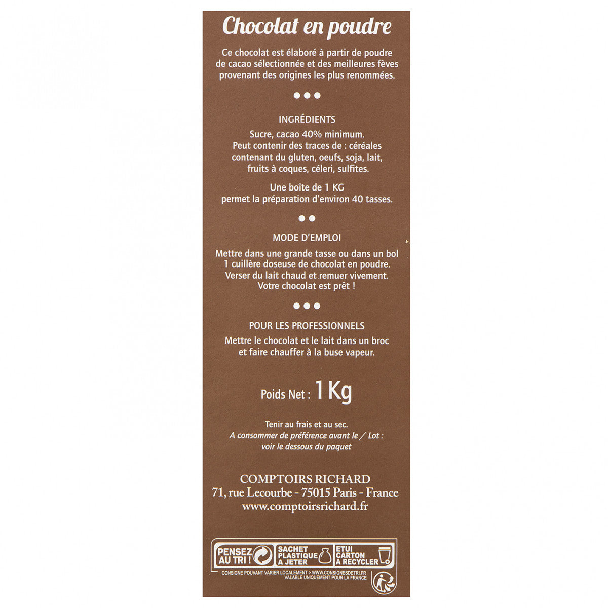 Comptoirs Richard-ის ფხვნილი შოკოლადი (1 კგ) საშუალებას გაძლევთ მოამზადოთ ნაზი ცხელი შოკოლადი, ზუსტად ისეთი, როგორც ფრანგ ბებიებს ჰქონდათ ჩვევად.